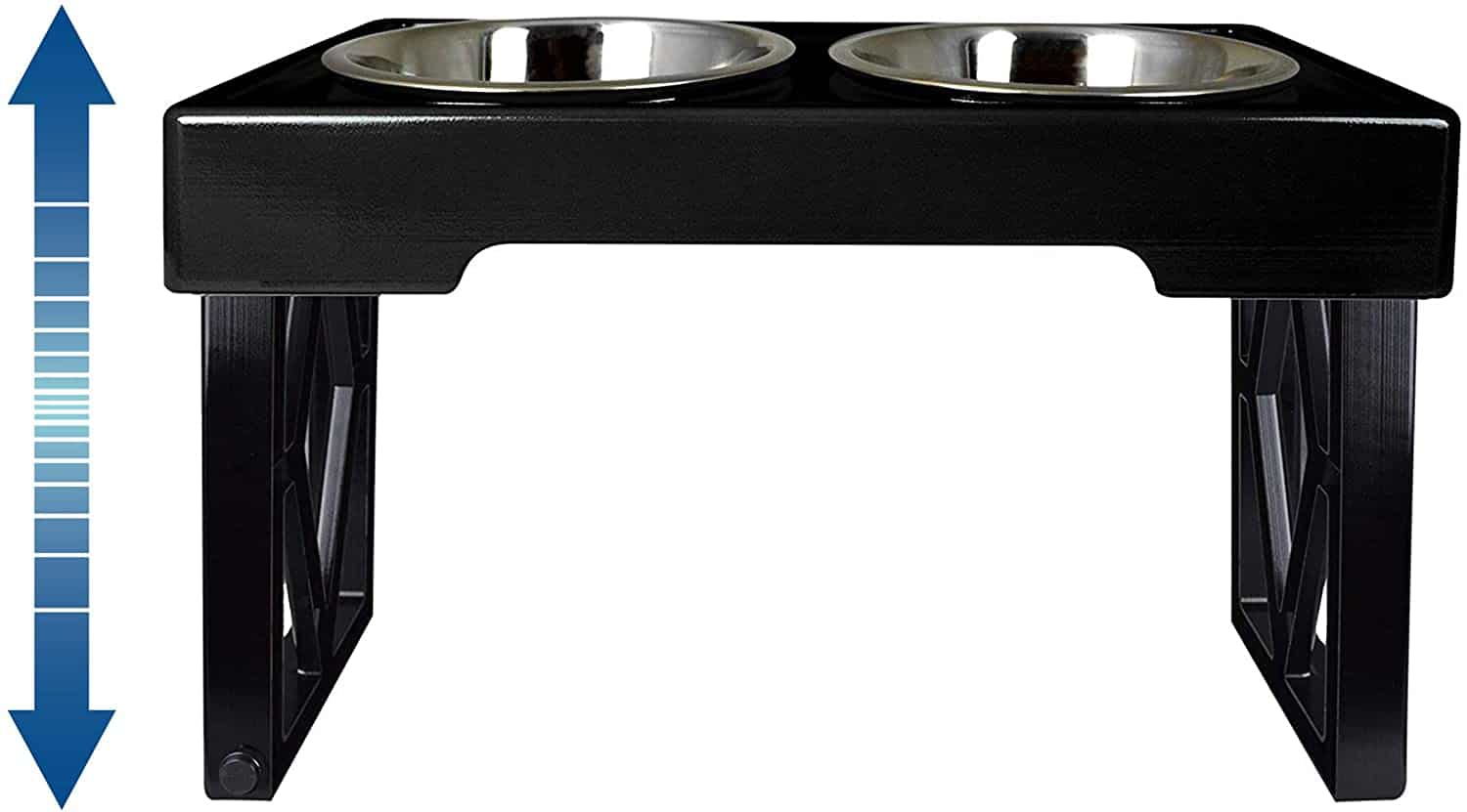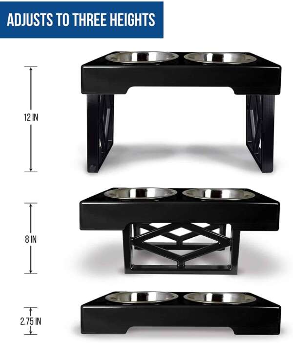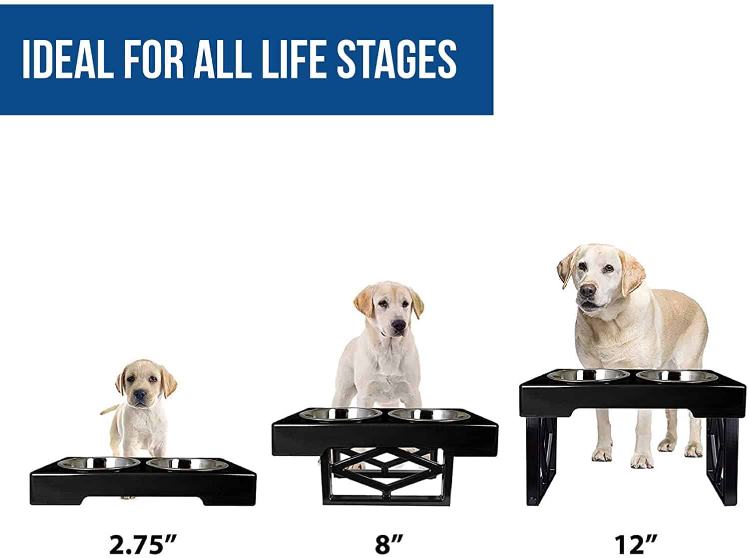 - IDEAL FOR ALL LIFE STAGES: Double Raised Feeder is one dog bowl for all life stages. This dog bowl adjusts to a 12-inch elevated dog bowl for large dogs, an 8-inch elevated dog bowls for medium dogs and a 2.75-inch bowl for small dogs.