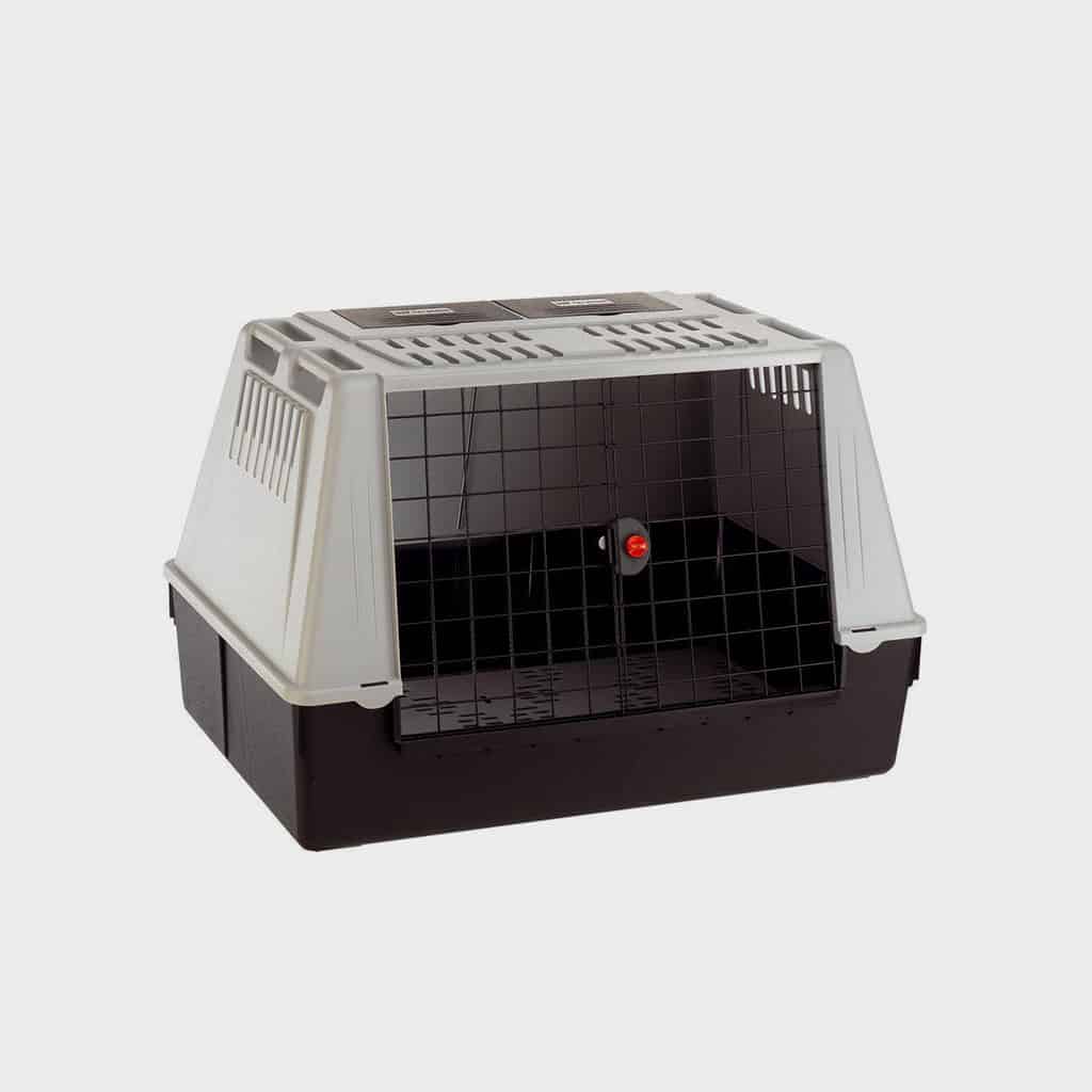 Traveling by car with your dog in complete safety has never been easier! This sturdy, lightweight pet carrier, made of plastic with a plastic-coated steel door is designed to be placed inside the boot of most cars. The carrier will easily fit in the boot of an average sized family hatchback and the carrying handles permit you to easily lift the carrier into the boot.